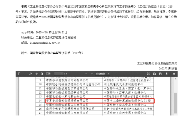 3月16日,工信部发布《2022年国家新型数据中心典型案例》公示名单,由宁夏誉成云创数据投资有限公司投建的“中卫云计算基地数据中心 C1 楼”成功获评“国家新型数据中心(大型数据中心)典型案例”,这是美利云中卫数据中心荣获“2022年度‘数字产业高质量发展’优秀案例”后,在数字经济绿色高质量发展中所扮演的典范角色再次得到认可。