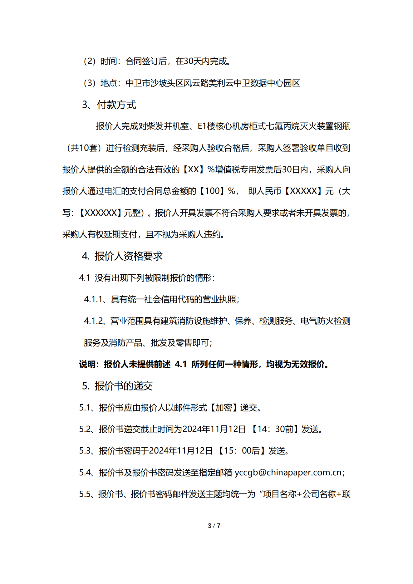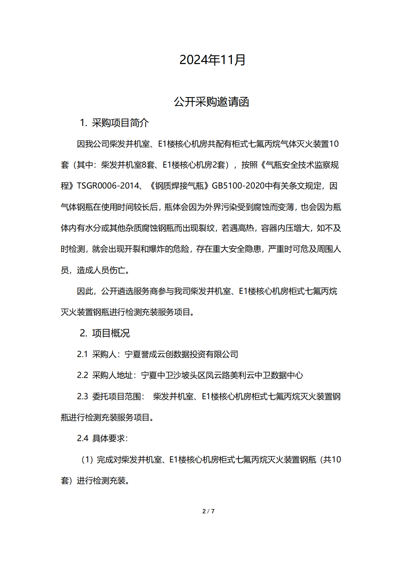 宁夏誉成云创数据投资有限公司(简称“誉成云创”),美利云中卫数据中心柴发并机室、E1楼核心机房共配有柜式七氟丙烷气体灭火装置10套(其中:柴发并机室8套、E1楼核心机房2套),按照《气瓶安全技术监察规程》TSGR0006-2014、《钢质焊接气瓶》GB5100-2020中有关条文规定,因气体钢瓶在使用时间较长后,瓶体会因为外界污染受到腐蚀而变薄,也会因为瓶体内有水分或其他杂质腐蚀钢瓶而出现裂纹,若遇高热,容器内压增大,如不及时检测,就会出现开裂和爆炸的危险,存在重大安全隐患,严重时可危及周围人员,造成人员伤亡。 因此,公开遴选服务商参与我司柴发并机室、E1楼核心机房柜式七氟丙烷灭火装置钢瓶进行检测充装服务项目。 采购信息详见附件【关于《宁夏誉成云创数据投资有限公司柴发并机室、E1楼核心机房柜式七氟丙烷灭火装置钢瓶进行检测充装服务项目》采购文件】。